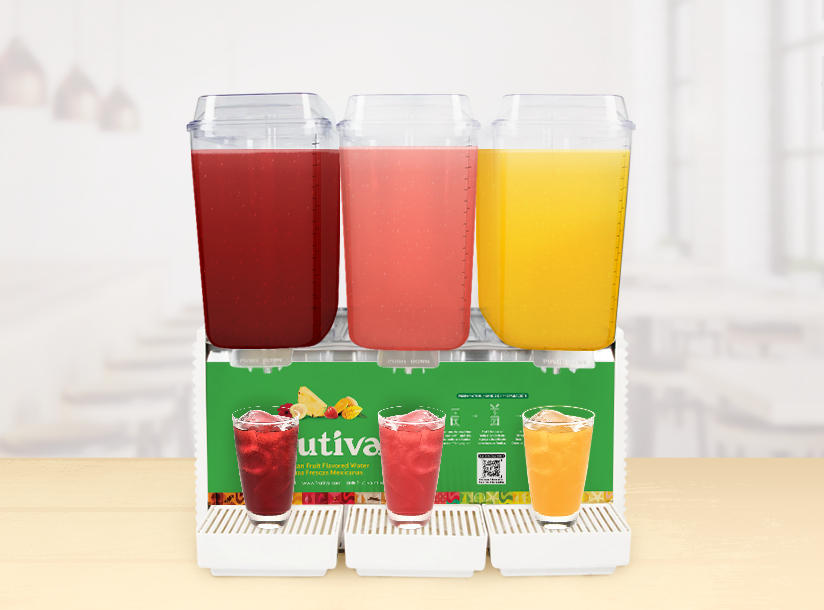 -Llene un 1/4 del tazón con agua. -Encienda la máquina para comenzar a enfriar y agitar. -Agregue 1 botella de concentrado Frutiva Esencial. No necesita azúcar. -Llene el tazón con agua. -Repita los pasos en cada tazón del dispensador.