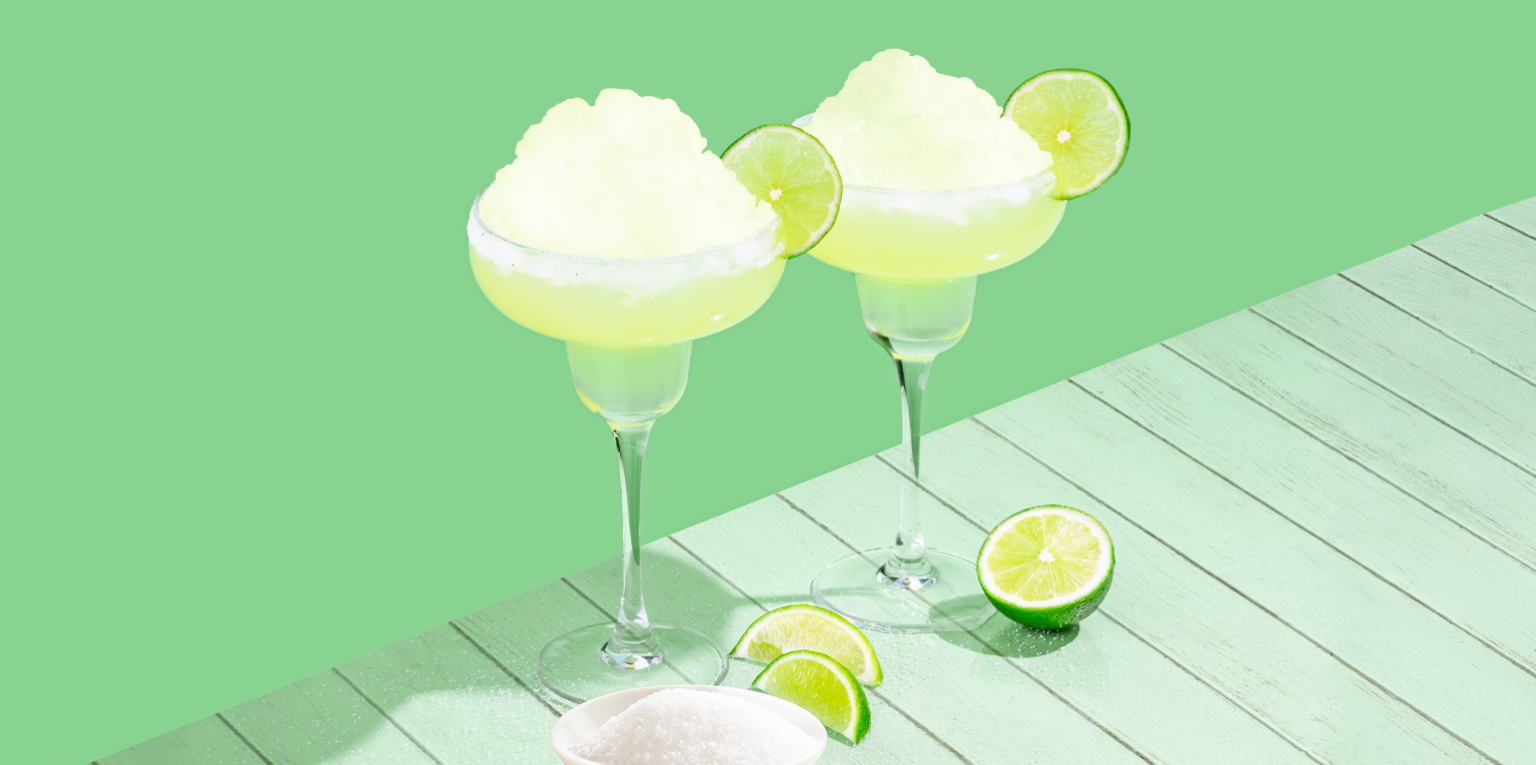 -4 cucharadas de concentrado Frutiva Margarita Mix -6 cucharadas de tequila -1 taza de hielo -1/2 taza de agua -Sal para escarchar -Rodajas de limón para decorar