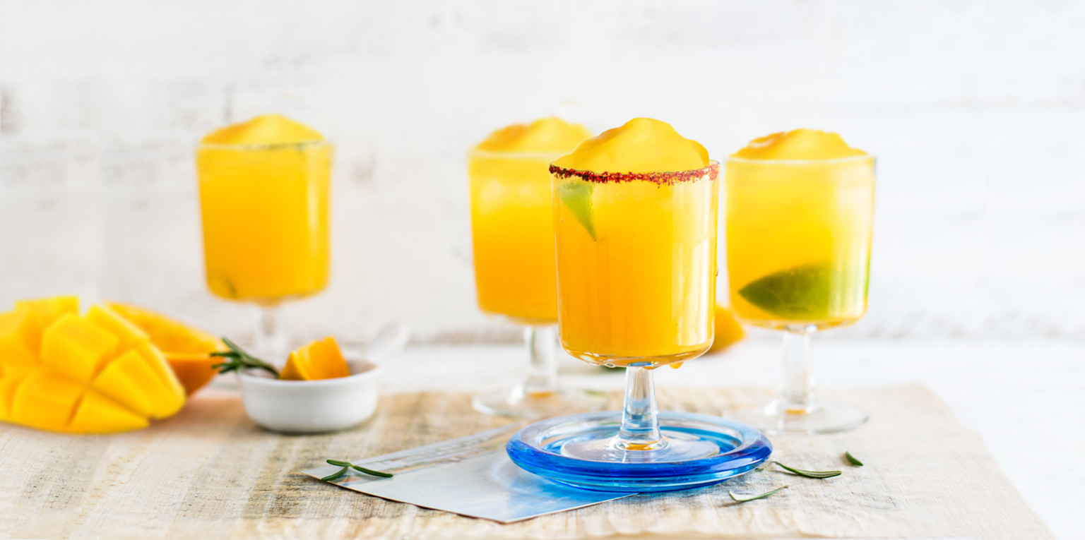 1.- Vierte el concentrado sabor mango, el tequila, el jugo de limón, los hielos y el licor de naranja en una licuadora y mezcla. 2.- Escarcha un vaso o copa con el chile en polvo. 3.- Vierte la mezcla de la licuadora en el vaso y disfruta.